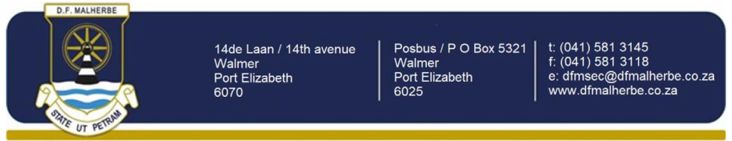 A dual medium, family orientated high school with an intense focus on academic, sporting, and cultural excellence; that is DF Malherbe. We live by and live out our five core values: respect, integrity, responsibility, empathy, and excellence in our everyday lives and make these values part of our way of life. We offer a kaleidoscope of opportunities and are committed to producing well rounded young men and women well prepared to fulfil their role in society.